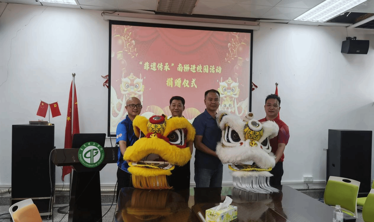 为弘扬国粹非遗文化,加强校园体育文化建设,营造多彩莞工体育氛围,传承岭南醒狮精神,7月12日,教育学院(师范学院)举办“非遗传承”南狮进校园座谈会暨捐赠仪式。广东省学生体育艺术联合会竞赛部部长祝健涛、海宇龙狮龙舟文化园赛事总监蓝纪升、学院党委书记张伟林、体育系教师代表及学校武术队队员等参加了活动。